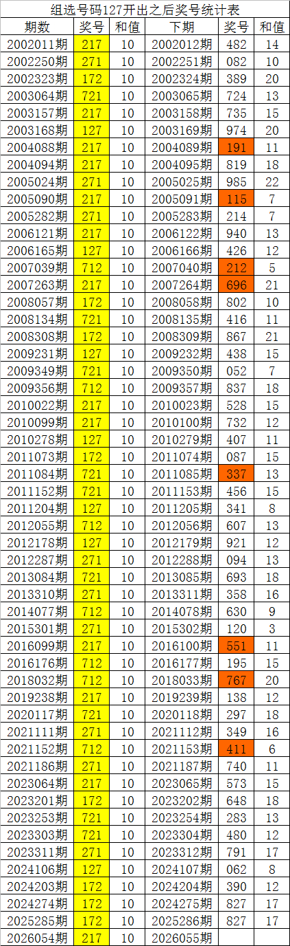 从以上统计不错看出,直选号码217出现之后,其下期奖号:1.下期大号出现概率100%;